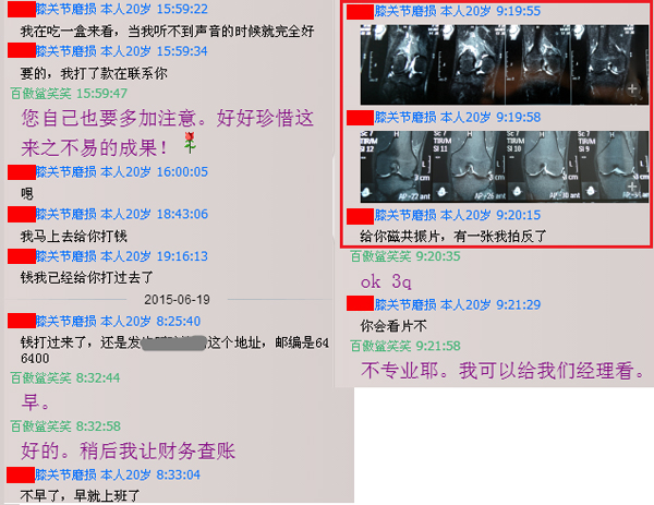 在六月底考察课结束,考试课办了缓考,我爸把我接回家。一回家就跟父母讲了这个药,他们因为我的腿很担忧和发愁,就说买一盒试试吧。我在官网找了笑笑姐聊,觉得她很耐心贴心,态度很好很专业的感觉,让我加深了对这个品牌的信任,劝说了妈妈用银行汇款买了三盒。我从七月初开始吃到现在。我在将近吃了一盒以后,发现关节弹响好了,这让我信心大增,想着再吃3个月应该就好了。(结果比我的预期还好)前几天去做核磁,检查结果是:膝关节少量积液。我看到这个结果简直要高兴的蹦起来,但我的腿让我只能站着。。。虽然核磁显示好了,但我现在走路多了依然关节会疼,医生也告诫我还不能运动或深蹲,否则容易复发。但这个结果已经让我很满意了,我才吃了一个多月呀,真是个奇迹呢,软骨粉功不可没!(谢谢你咯)
