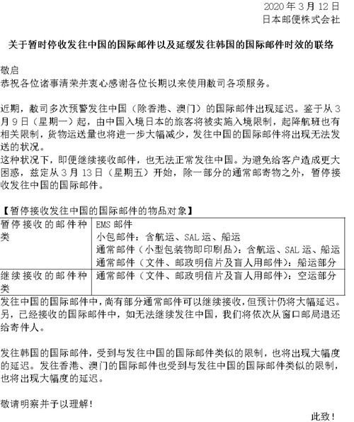 接日本邮局通知,因受新型冠状病毒性肺炎影响,日本飞往中国的飞机停运,自3月12日起,日本邮局将暂时停收发往中国的软骨粉国际邮件。以下附上日方邮局通知文件及翻译文件。