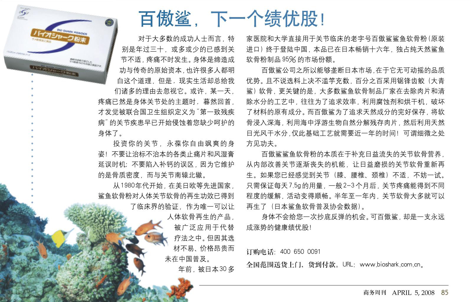 百傲鲨鲨鱼 软骨粉(纯天然锯峰齿鲛软骨粉)进入中国市场之后,一直受到各级媒体的广泛关注和报 道,并且获得广泛的良好口碑和评价。感谢各界的监督和支持,我们将努力把工作做得更好!