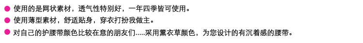 网状结构,透气性强,具有良好的保温能力和隔热能力。三层绑带既可固定腰椎,又可柔和贴身,舒适度极佳。护髋护腰,收腹塑身,特别适合产后妇女的身材恢复。 |